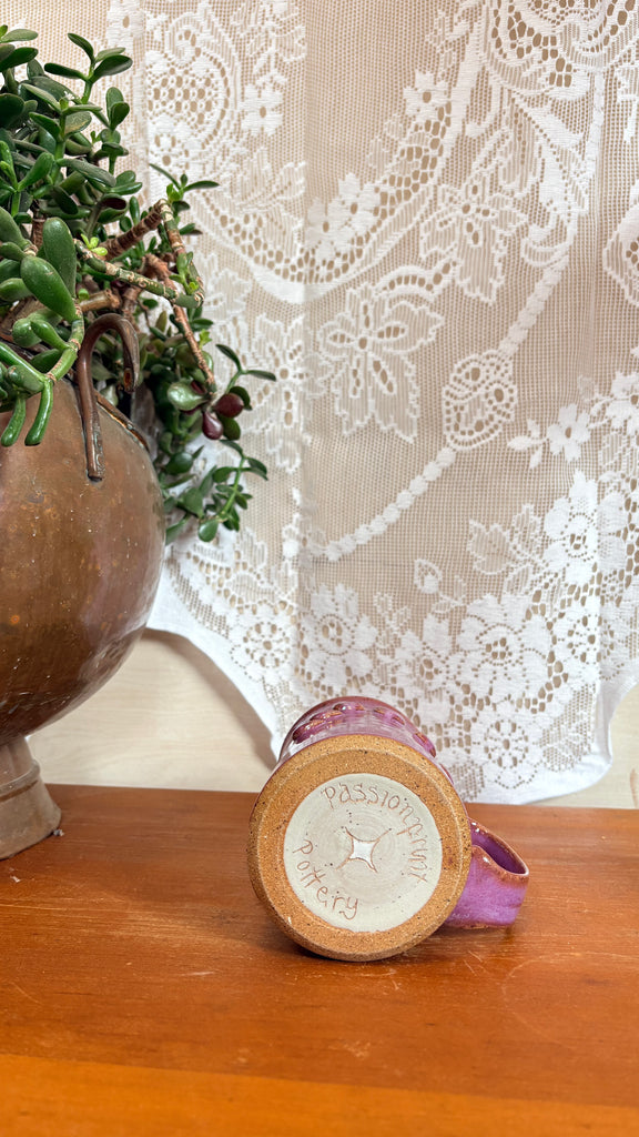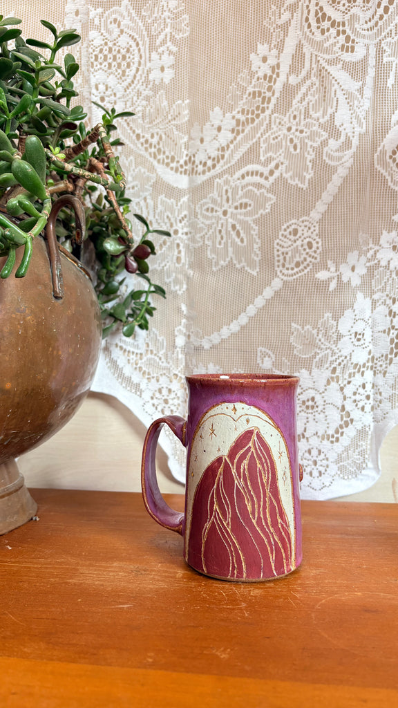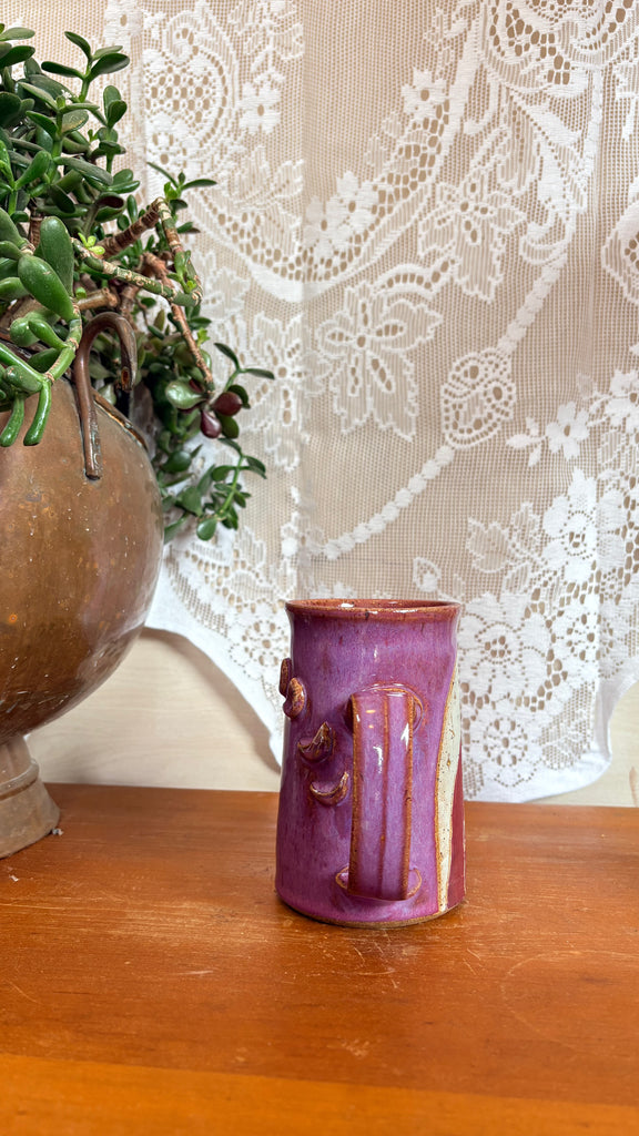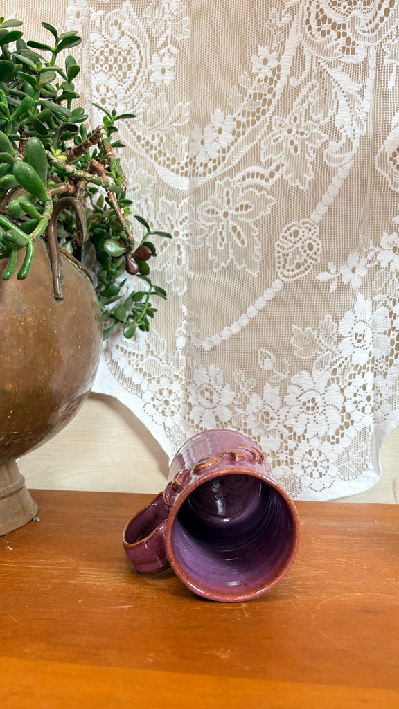 Hand-painted and carved, red-purple floating glaze with mother of pearl and gold lustre!